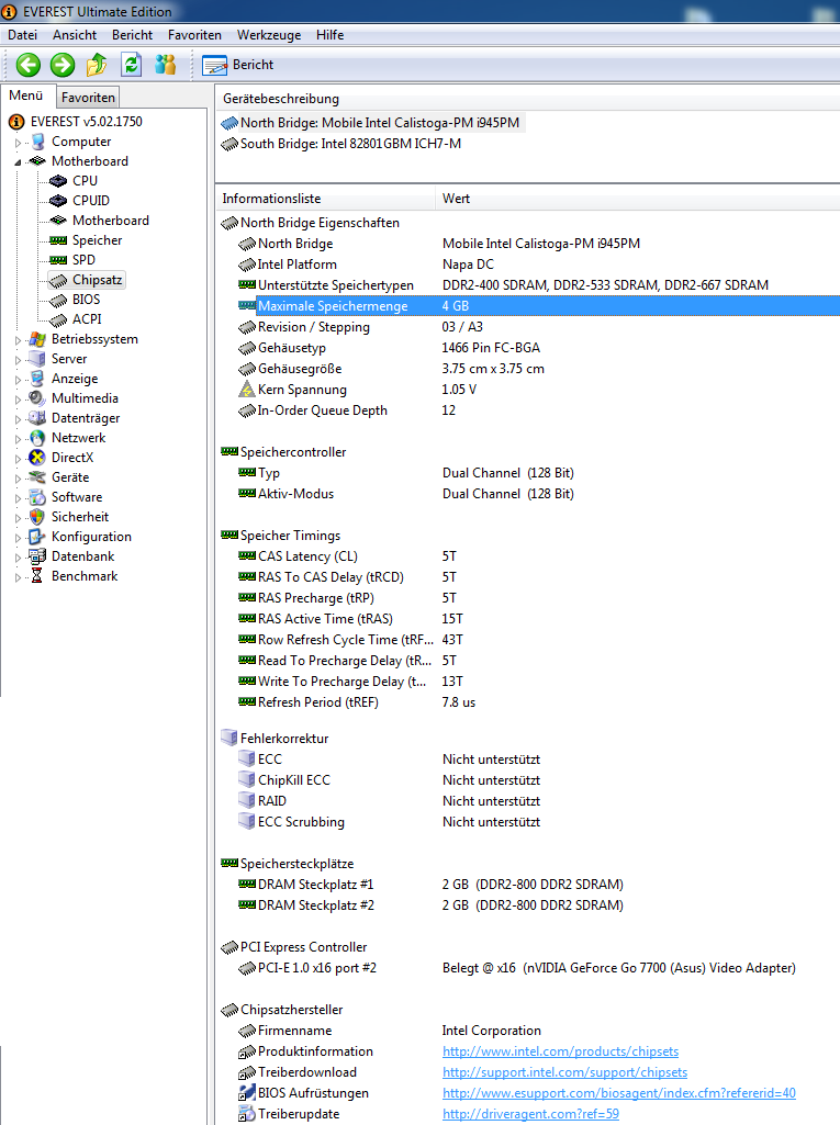 Im BIOS und im Leistungsindex stehen natürlich weiterhin 4. CPU-Z erkennt auch 2 x 2048 MB. Es ist DDR2-1066 mit 5-5-5-15-25, 2T. Wie gesagt benutze ich ein 64 Bit System also fällt OS schonmal raus - außerdem habe ich PAE aktiviert und Everest zeigt es seit jeher als aktiv an.