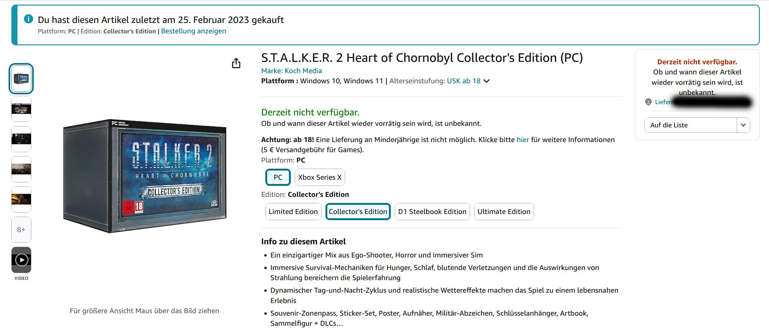Ich freu mich auch drauf, aber ich werde nicht gleich zum 20/11 kaufen (auch wenn "die Finger jucken"). Erstmal schauen, in welchem Zustand das Spiel ist beim erscheinen. Wenns gut ist, dann werd ich recht zeitnah kaufen-=[CrysiS]=- schrieb:Ich freue mich mal seit langem auf kein anderes Spiel, so sehr wie auf Stalker 2!