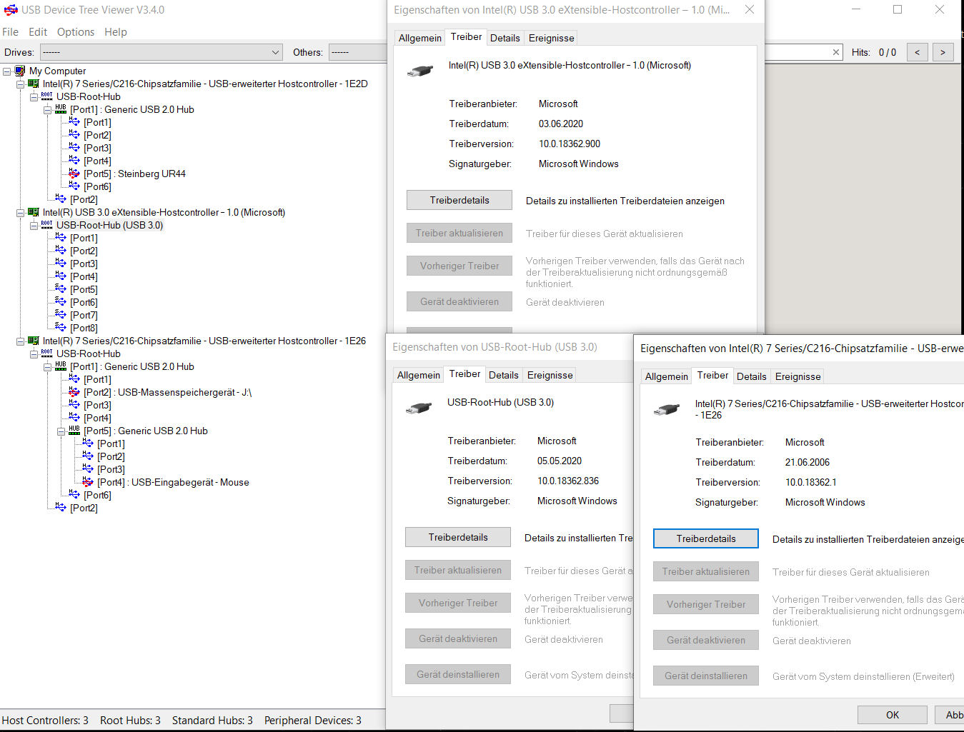 In der Hoffnung, zu verstehen, wo mein Problem liegt, habe ich das Programm USB Device Tree Viewer gestartet. Ich habe hier mal ein Bild mit der USB-Baum-Ansicht von USB Device Tree Viewer angefügt, auf dem auch Informationen zu den Treibern zu finden sind.