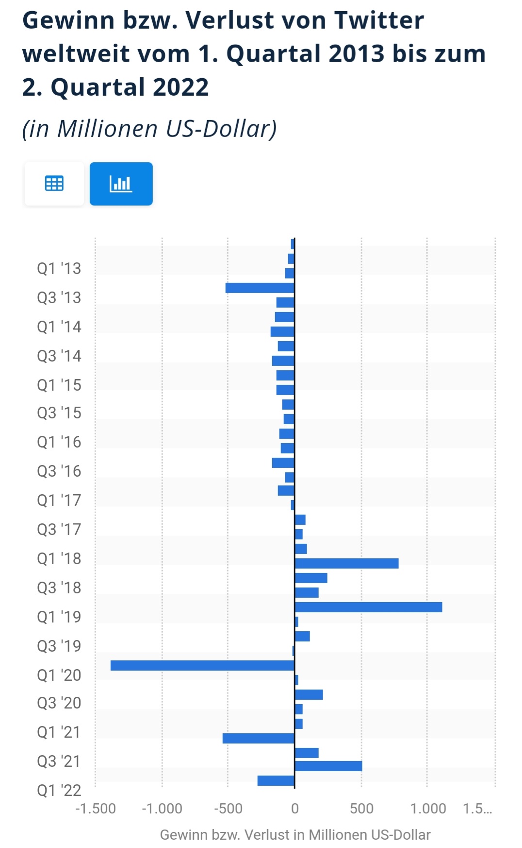 Hm mal kurz nachgeschaut:Wictale schrieb:Twitter hat es in all den Jahren und der enormem Reichweite nicht geschafft profitabel zu werden.