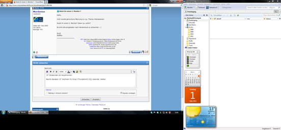 Bei mir ist der 2. Monitor (19 Zoll; 1280x1024) angeschlossen, wird aber nur eingeschaltet, wenn auf dem Hauptmonitor (24 Zoll; 1920x1200) der Platz ausgeht.