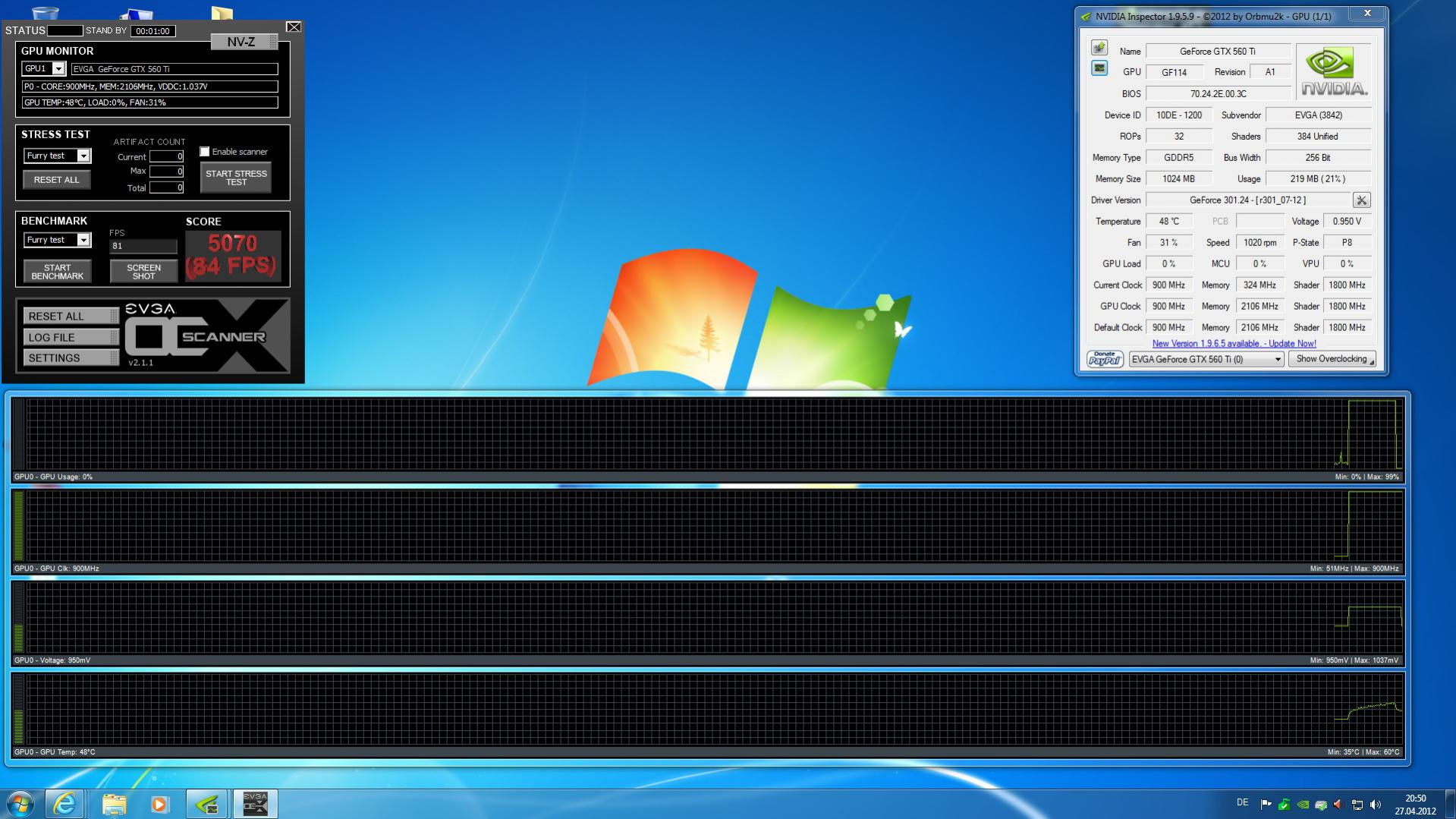 Ausserdem habe ich noch weitere Tests mit dem 301.24 Treiber durchgeführt und ich konnte, einen Einbruch des P0-States während des ersten Benchmarks von 3dmark Vantage auf den P8-State (405 Mhz) messen.