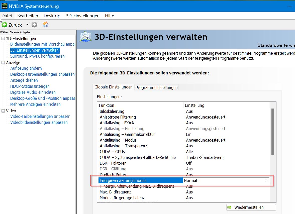 - in der NVIDIA Systemsteuerung unter 3D-Einstellungen verwalten -> Energieverwaltungsmodus auf "maximale Leistung bevorzugen" gestellt. (siehe Screenshot)