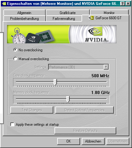 Ihr kennt doch sicher Coolbits zum Übertakten. Ich hab ne 6600GT, Standardtakt 500/1000 (Effektivwert). Das neue Interface erkennt das nicht richtig, und würde den Speicher eiskalt auf 2000 setzen. Naja, würde schon nicht schief gehen, übertakten tun so oder so nur User, die wissen, welchen Takt ihre Graka hat.