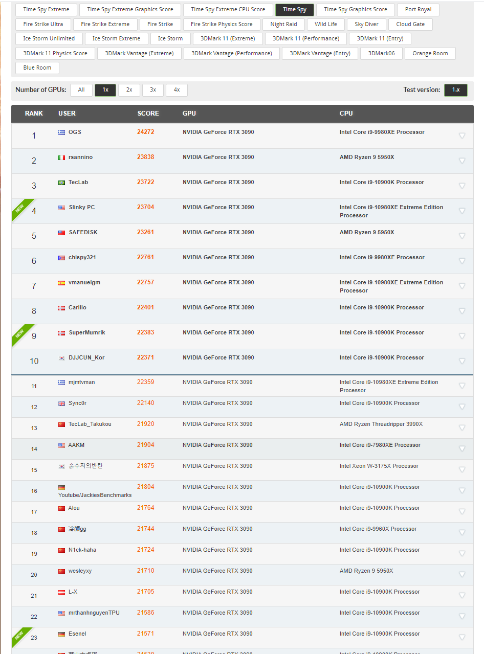 | 22.735 | ASUS ROG Strix RTX 3090 OC (500W Evga Bios) - EK Block | 2.130 MHz / 2.762 MHz | i9 10900K 32GB DDR4 4300 CL16 | @Esenel | 27.11.20 |