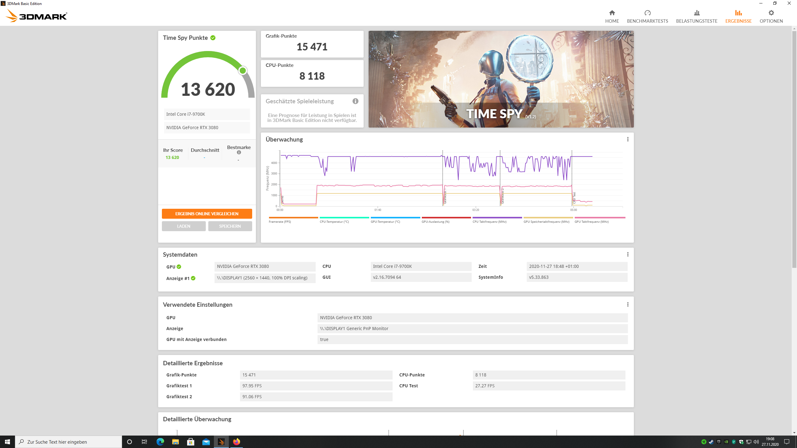 Ich habe mal geschaut was so geht mit meinem kleinen i5 8600K und der RTX 3080 mit OC und meinem normalen Arbeitsspeicher mit 3200 MHz im Time Spy Benchmark:
