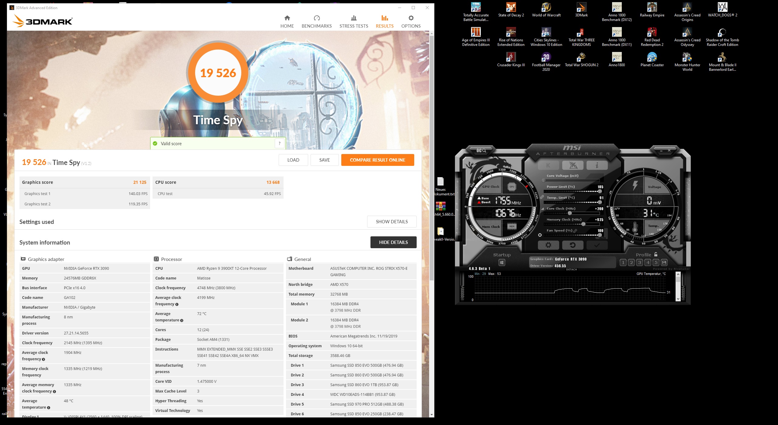Graphics-Score Typ / Hersteller Core /VRAM System User Datum 21.624 EVGA GeForce RTX 3090 FTW3 Gaming 1.987 MHz / 2.576 MHz Ryzen 7 3700X