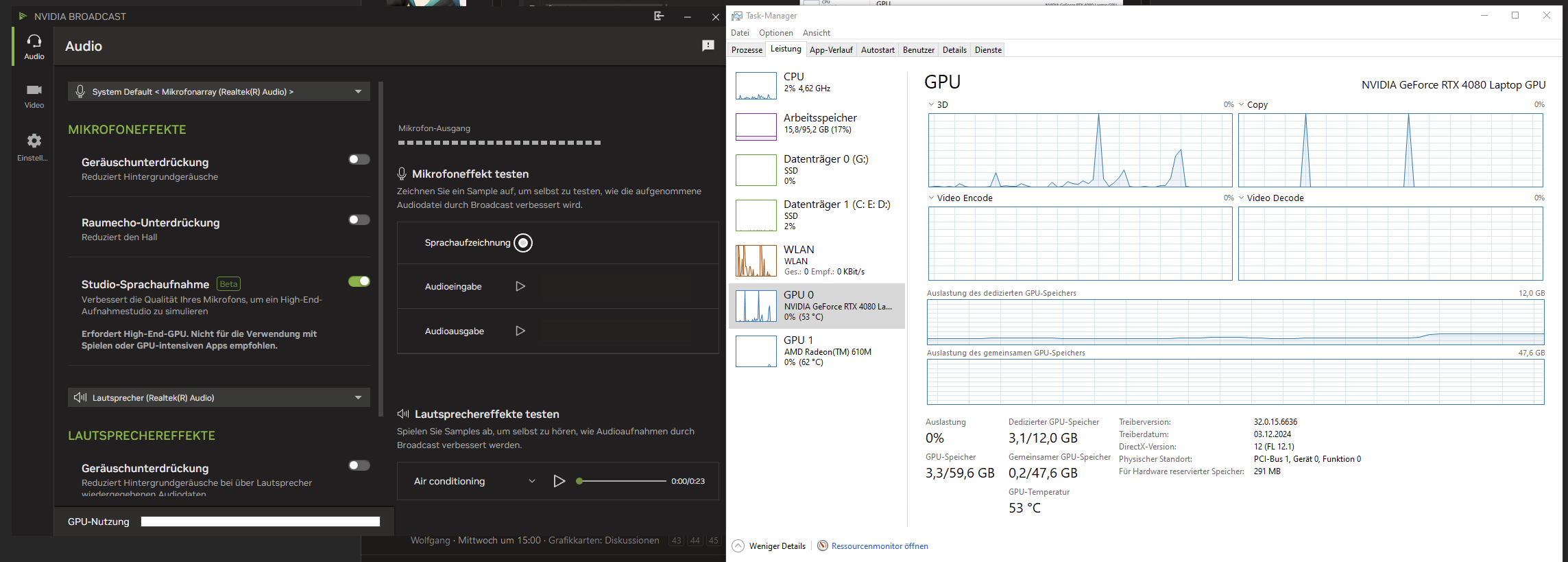 Ich kann bestätigen das alle neuen Nvidia Broadcast Funktionen problemlos auf einer 4070 Ti Super laufen. Die Funktion "Studio-Sprachaufnahme" benötigt kaum 10% Leistung, läuft daher sicherlich auch auf kleineren Modellen.