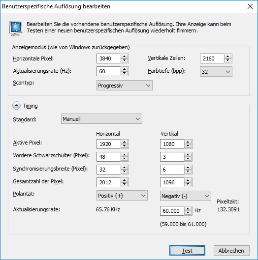 Mir ging es tatsächlich nur um das Downsampling, hier könnte das "Custom Resolution Tool" genau das sein, was ich suche. Werde es mal ausprobieren bei Gelegenheit. Hintergrund ist der, dass ich glaube (und sehe), dass das Nividia DSR qualitativ besser und sauberer läuft als eine Custom-Auflösung. Für 4K sieht die bei mir so aus und ich weiß ehrlich gesagt nicht, ob das wirklich optimal ist: