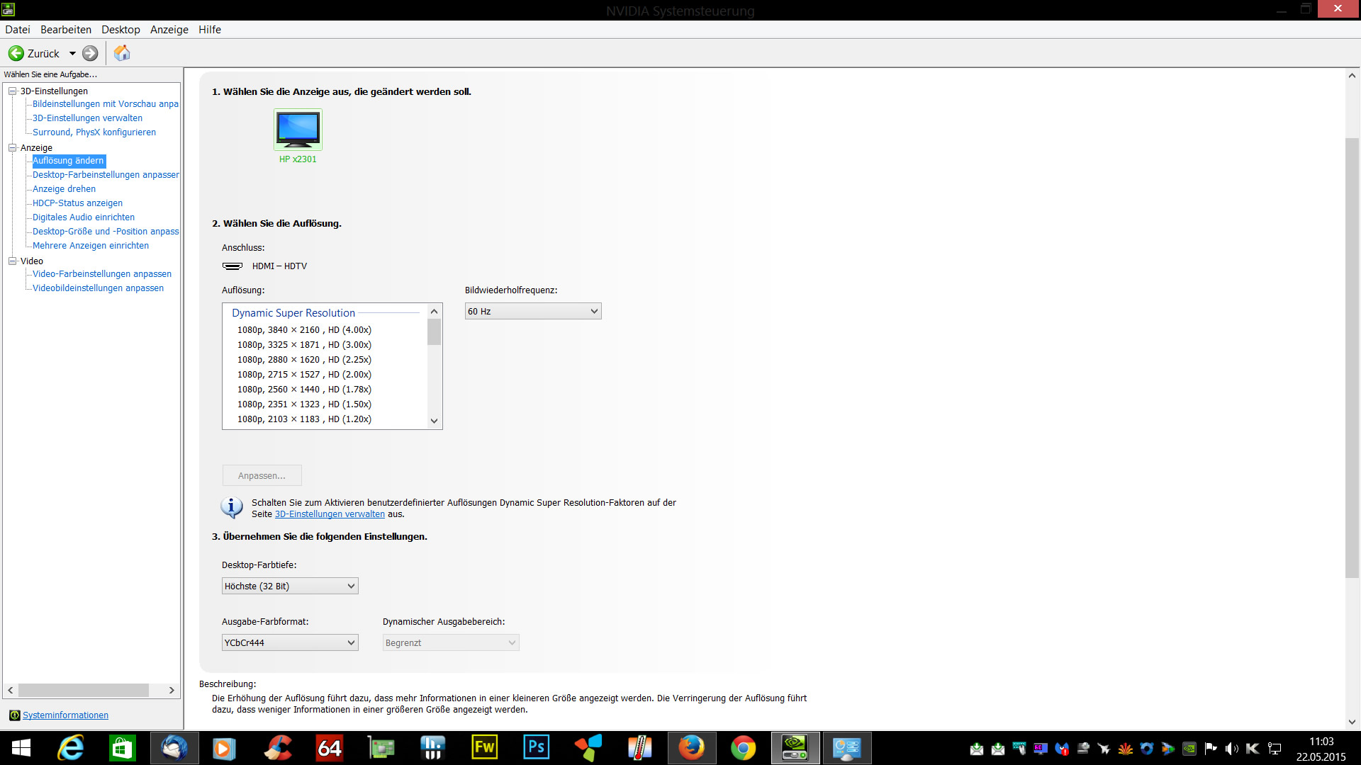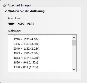 Ich setzte in der NVIDIA Systemsteuerung unter "3d Einstellungen verwalten" einen entsprechenden Haken bei z.B. 1813 x 1024 (1,78x), siehe screenshot.