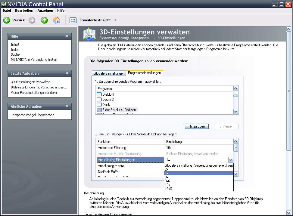 Einmal dort angelangt, kann man globale Einstellungen vornehmen, d.h. diese Einstellungen werden für alle Spiele benutzt. Viel wichtiger sind aber die Spielprofile unter "Programmeinstellungen". Dort kann man vorhandene Profile editieren und dem eigenen Wünschen anpassen, aber auch neue Profile anlegen, wenn das Spiel nicht in der Liste sein sollte. Und genau hier habe ich dann auch 16xAA eingestellt bei Elder Scrolls 4: Oblivion.