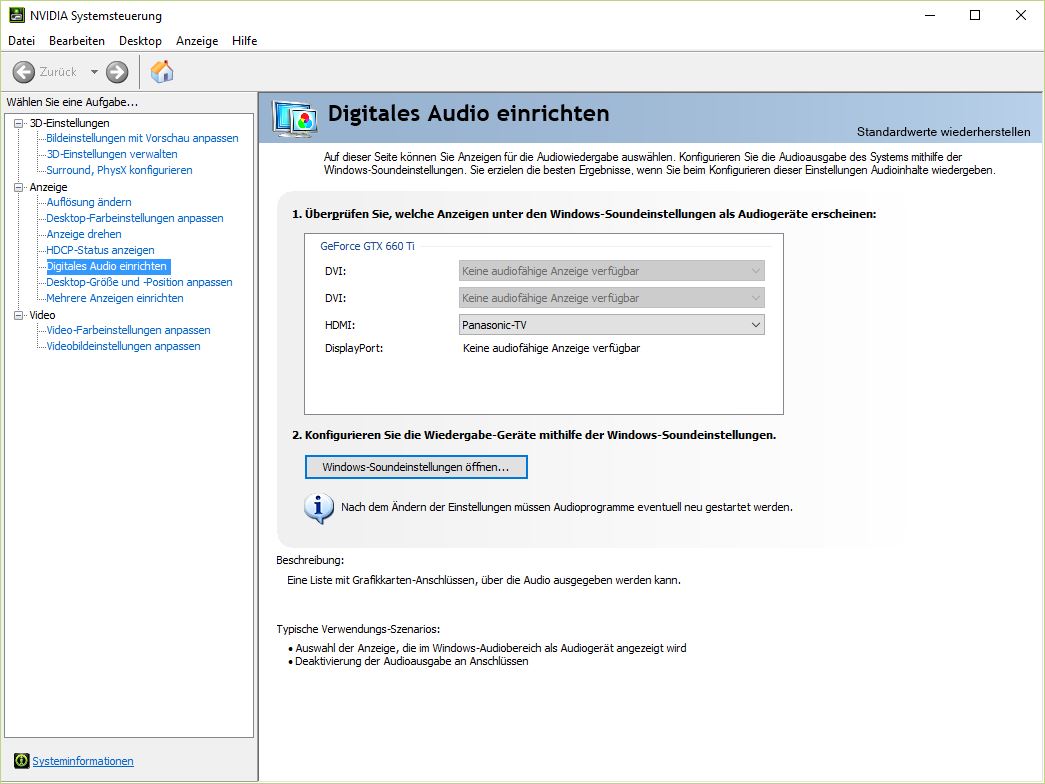 Ich habe meinen PC Monitor per DVI an der Grafikkarte (GF GTX 660 Ti) angeschlossen. Ich möchte gerne, dass über den HDMI Anschluss der Grafikkarte, welches an einen Yamaha RX-V475 angeschlossen ist, der Sound vom PC abgespielt wird.
