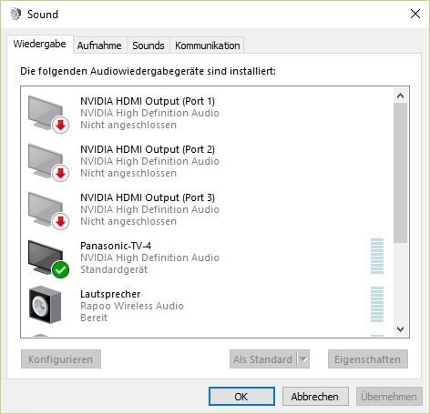 Der Receiver ist über HDMI Out an den TV angeschlossen. In der Nvidia Systemsteuerung wird unter "Digitales Audio einrichten" der AV Receiver aber nur dann angezeigt, wenn man unter "Mehrere Anzeigen einrichten" den TV auch aktiviert hat. Wenn der TV aktiviert ist, aber im ausgeschaltetem Zustand ist, wird der Receiver auch nicht angezeigt. Wie kann man es einrichten, dass der Receiver immer als Wiedergabegerät in den Soundeinstellungen wählbar ist?