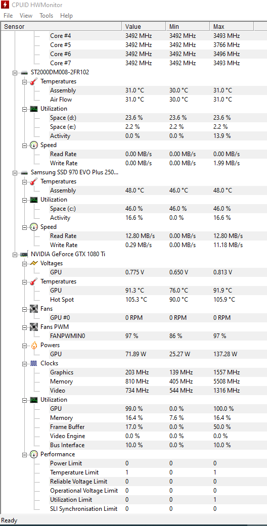 Ich hoffe Ihr könnt mir weiterhelfen bzw. meine Vermutung bestätigen. Ich habe seit 2017 die oben genannte Grafikkarte verbaut, lief bis vor ein paar Wochen relativ Problemlos. Dann hat sie angefangen bei Spielen die normalerweise keine nennenswerte Leistung benötigen extrem ins schwitzen zu kommen. Vorher konnte ich dieses Spiel (NosTale - MMORGP) Problemlos 5-10 öffnen und die Grafikkarte war bei 60~70% Auslastung und hatte eine Temperatur von 50~60%. Dann eines Tages haben Videos die ich auf dem zweitbildschirm schaue angefangen zu stottern. Habe die Auslastung kontrolliert und die Auslastung war auf einmal bei 100% und Temperatur bei 90~91° - Kerntemperatur 100°+. Zu erst war es nur sporadisch bei diesem einen Spiel mittlerweile aber auch bei anderen Spielen (Rocket League, PUBG etc). Ich fahre den PC hoch und habe eine Auslastung der Graka von 0 - 5% und eine Temperatur von unter 30°. Sobald ich ein Spiel wie Rocket League starte, knallt die Auslastung innerhalb von ein paar Sekunden auf 100% hoch und die Temperatur geht auch sofort auf 90~91° hoch und ich habe extreme FPS Einbrüche weil sich die Grafikkarte natürlich bei den Temperaturen runter taktet. Unten ein paar Screenshots von MSI Afterburner und HWMonitor als ich PUBG gestartet habe. Das komische ist, es tritt nur sporadisch auf, letztes Wochenende habe ich 8h am Stück PUBG auf Grafikeinstellungen Ultra gezockt und die Temperatur war dauerhaft bei ca. 60°, Auslastung war nicht mal Ansatzweise bei 100%. Sie dümpelte irgendwo bei 20~50% rum. Habe jetzt auch während ich diesen Text schreibe, Rocketleague gestartet und Auslastung bei 40% und Temperatur der Graka bei 40°. Es tritt also ziemlich ziemlich sporadisch auf und komplett random. Ich befürchte das etwas mit der integrierten Wasserkühlung nicht in Ordnung ist, kann es aber nicht kontrollieren weil meine Fähigkeiten dafür leider nicht ausreichen und ich auch gelesen habe das die EVGA Grafikkarten eigentlich nicht dafür gemacht sind sie aufzuschrauben.