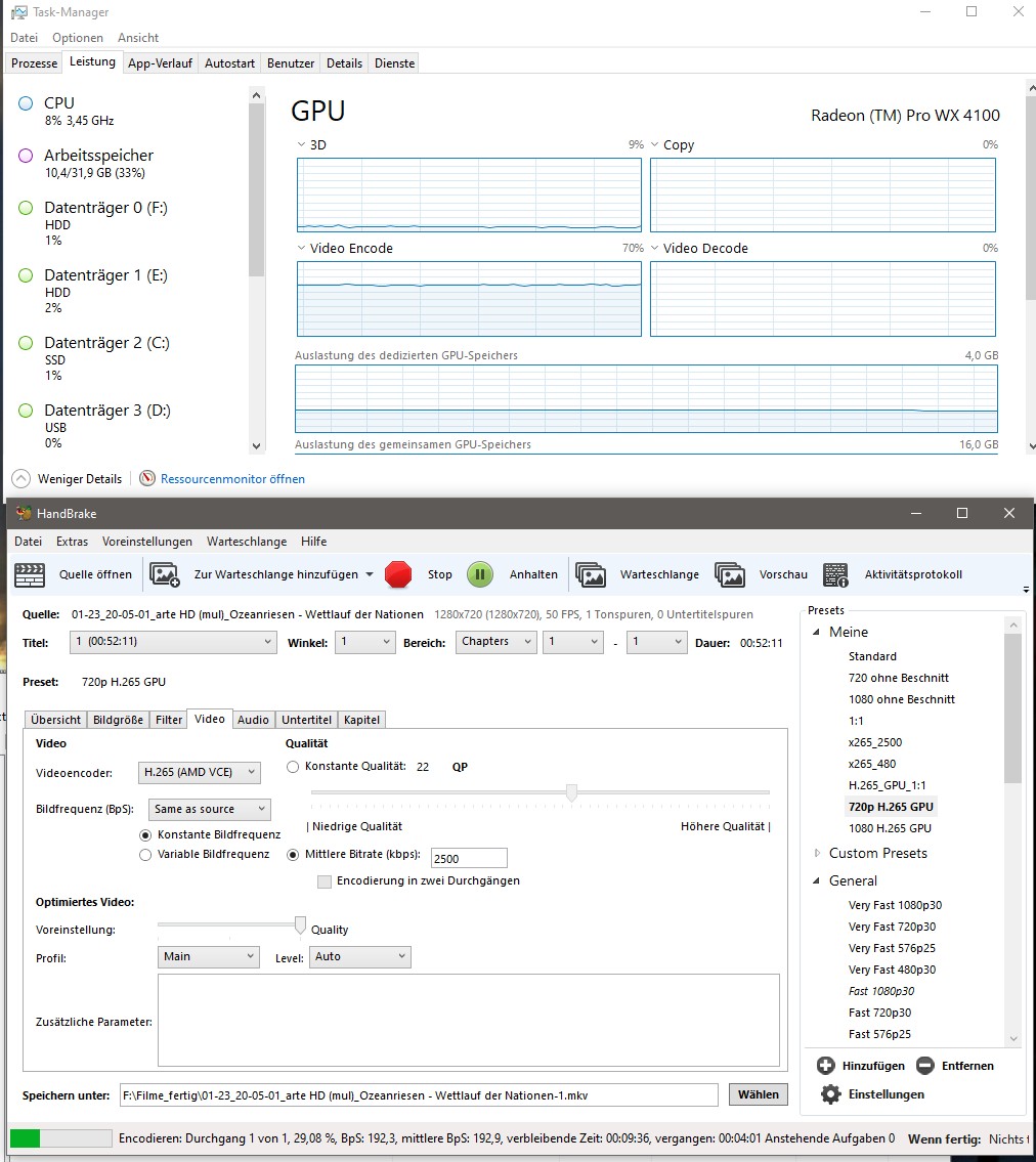 Man kann die Grafikkarte auch als Encoder benutzen, wenn diese darauf verbaut sind und nach außen zugänglich. Das ist bei den AMD-Pro der Fall, so daß man im Programm (Handbrake zB.) als Encoder "AMD VCE" auswählen kann. Und zwar für H.264 und H265. Und in Taskmanager sieht man dann auch, daß die CPU vor sich hin idlet, während die Grafikkarte bis zu 100% für Encoding ausgelastet wird. Und das Ergebnis ist (inzwischen) optisch genauso gut wie mittels CPU gerenderte Videos, und die benötigte Zeit ist erstaunlich gering. Mein (undervolteter) R9 3900X braucht für H.264 etwa ein Viertel mehr Zeit als die Grafikkarte. Bei H.265 ist der Unterschied noch gewaltiger, aber da ist der Software-Codec wohl noch nicht ausgereizt, da die CPU hier nur um die 30% läuft. Die Grafikkarte ist da aber genauso fix wie mit H.264. Dafür spart man aber ieen Menge an Strom dabei.