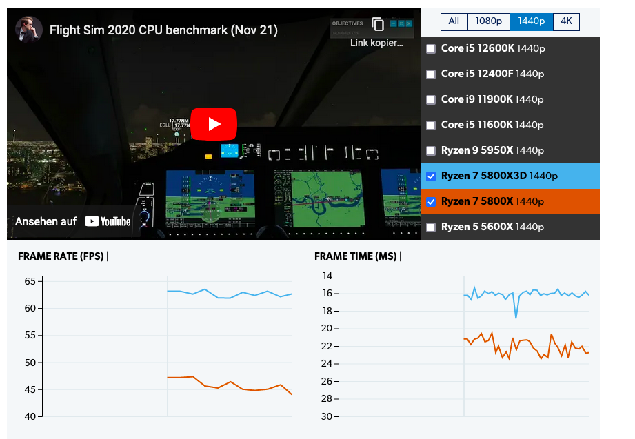 In welcher Auflösung spielst du?Sun-Berg schrieb:@Recharging Das liegt möglicherweise daran, dass FS2020 CPU limitiert ist. Bei mir hat der Wechsel von einem 3600XT zum 5800X3D einen sehr deutlichen Leistungsschub gebracht.