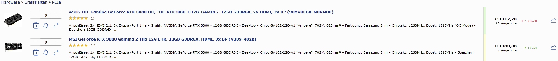 3080 (10)Vigilant schrieb:Wie gibt es die (12 GB) 3080 denn aktuell für 719 €? Custom, neu und vertrauenswürdiger Händler.