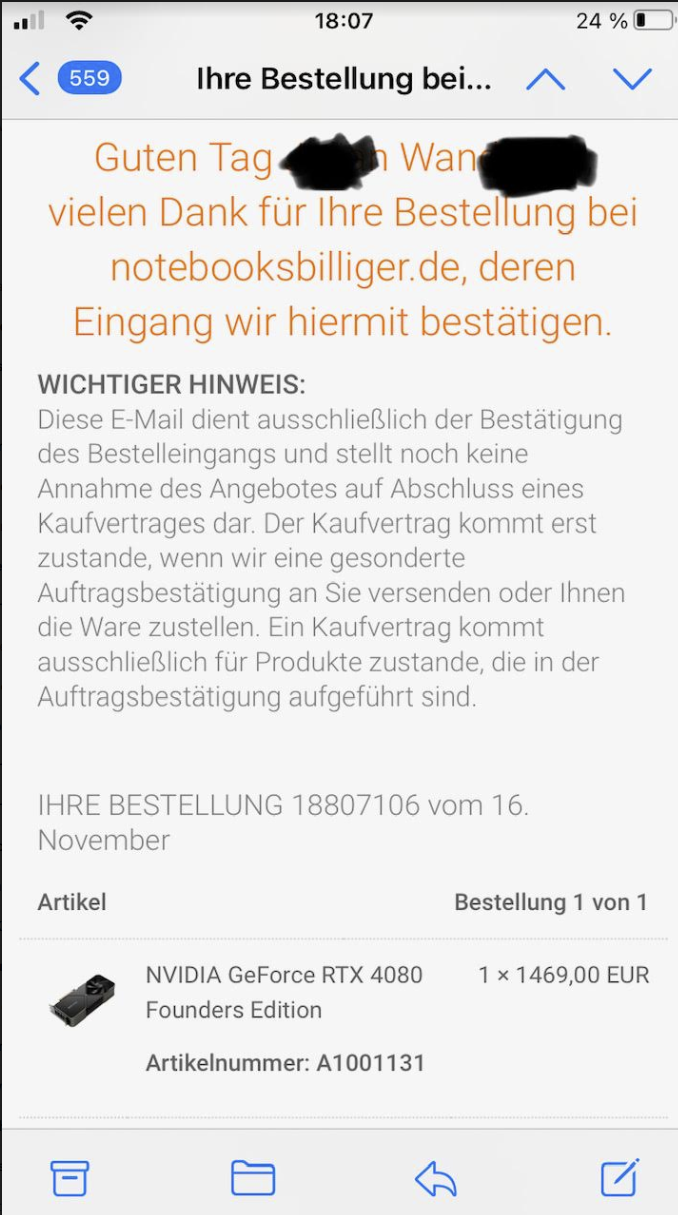 Anscheinend nicht...eine offizielle Mail seitens Notebooksbilliger kam noch nicht aber die Karte steht auf deren Seite auf storniert.