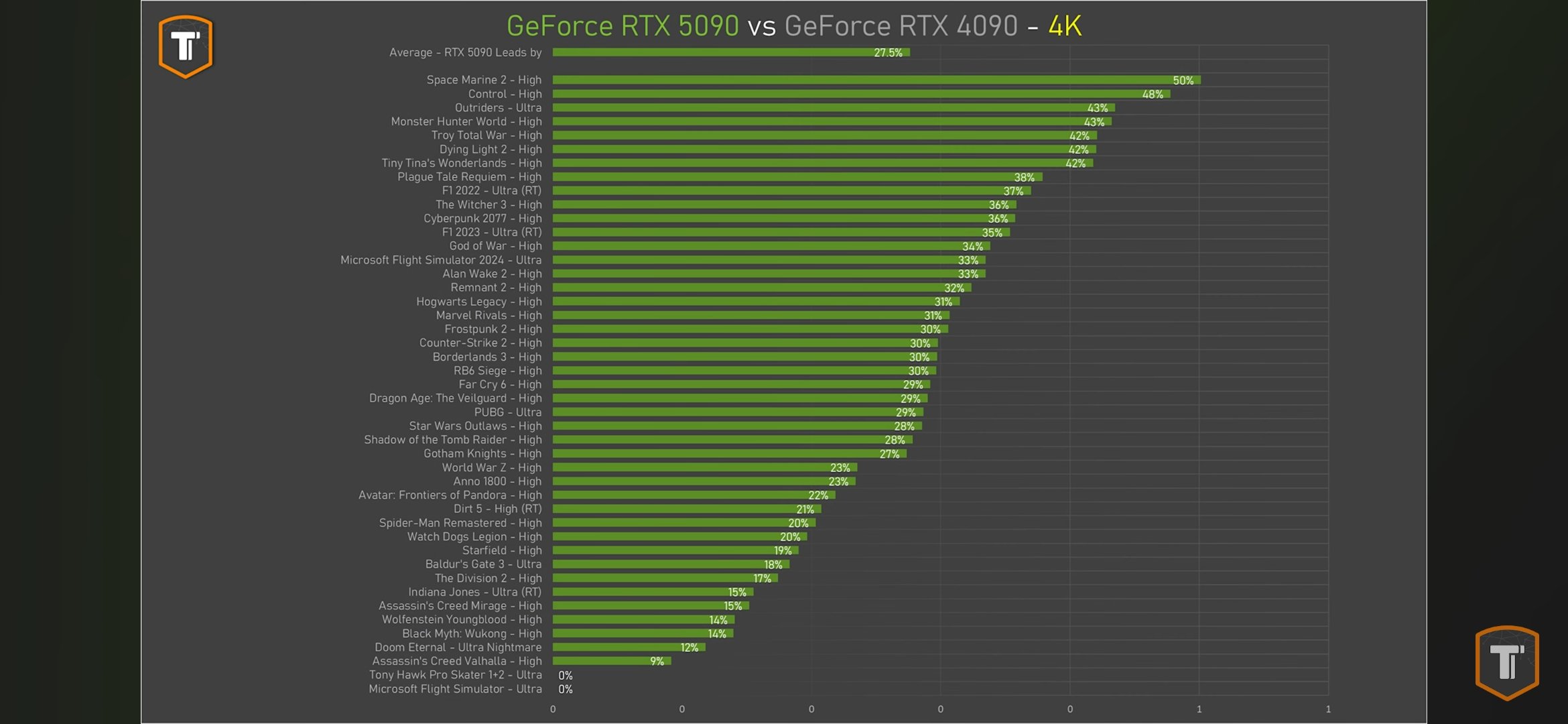 Ich bin mir sicher, dass wir dieses Jahr 2025 zahlreiche Games sehen werden, in denen die 5090 eine 4090 um 40-50% mehr fps deklassiert und bereits in den 0.1% Percentil fps deutlich vor den avg fps for einer 4090 landet, also noch flüssiger mit mehr fps läuft und noch weichere/smoothere Frametimes abliefert.