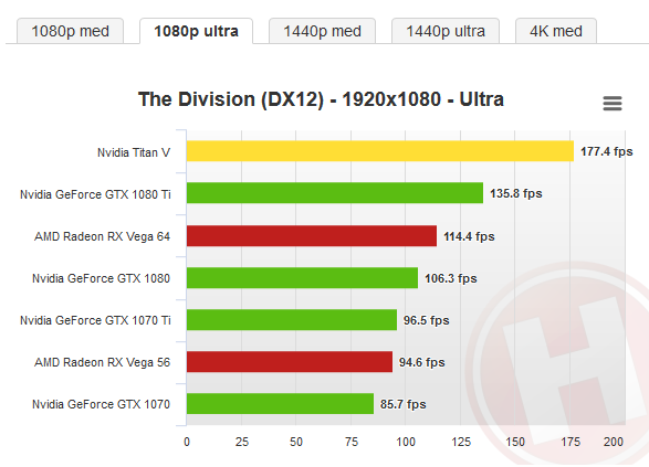 Chillaholic schrieb:Schlechter Vergleich finde ich, die DX12 Umsetzung lief sogar auch auf meiner 1080 auf über 100 FPS. Mit minimal verringerten Effekten auch auf 140+. https://us.hardware.info/reviews/80...a-titan-v-review-benchmarks-the-division-dx12