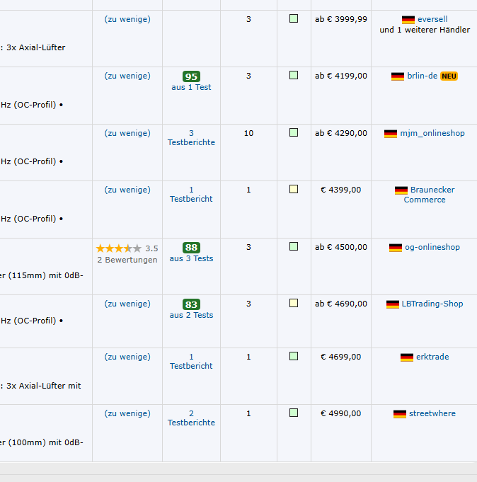 Solange die Verfügbarkeit bei Geizhals so aussieht, braucht man sich auf billige GPUs aus dem Handel keine Gedanken zu machen. Angebote unter 3000 sind derzeit schlichtweg unrealistisch, der Händler der sich das antut parkt nur sein Geld bei den Scalpern. Anhang anzeigen 1595822