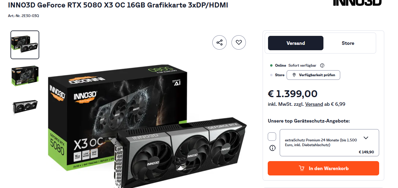 - INNO3D GeForce RTX 5080 X3 OC 16GB Grafikkarte 3xDP/HDMI* (1.399,00 €, Cyberport)