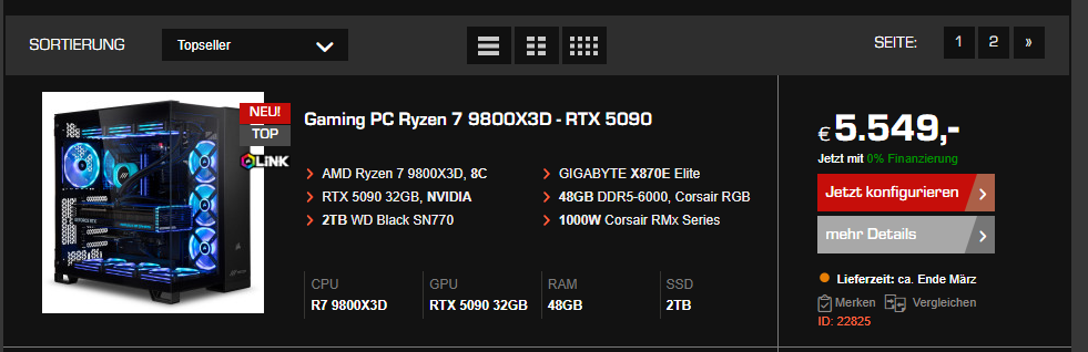 Lieferzeit Ende März, das klingt ja sogar realistischaLanaMiau schrieb:Puh... wenn ich mir die Preise für 5090 anguck, sind die Komplettsysteme ja sogar fast günstig: