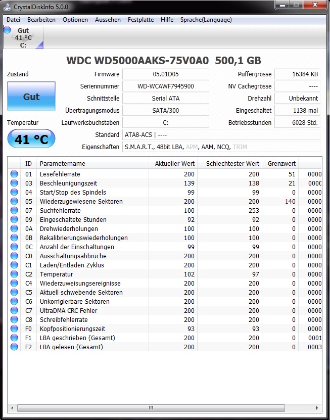 Die sieben UDMA CRC Fehler deuten u.U. auch auf ein Problem mit dem Datenkabel der Festplatte, oder dem Controller hin. Tausche hier auch das Datenkabel der Systemplatte aus und beobachte den Wert regelmäßig. Dieser darf nicht weiter ansteigen.