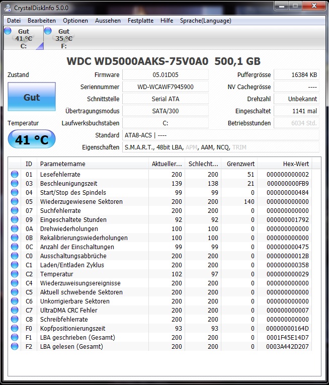 Poste bitte auch noch einen Screenshot von CrystalDiskInfo (SMART Werte der Festplatte).