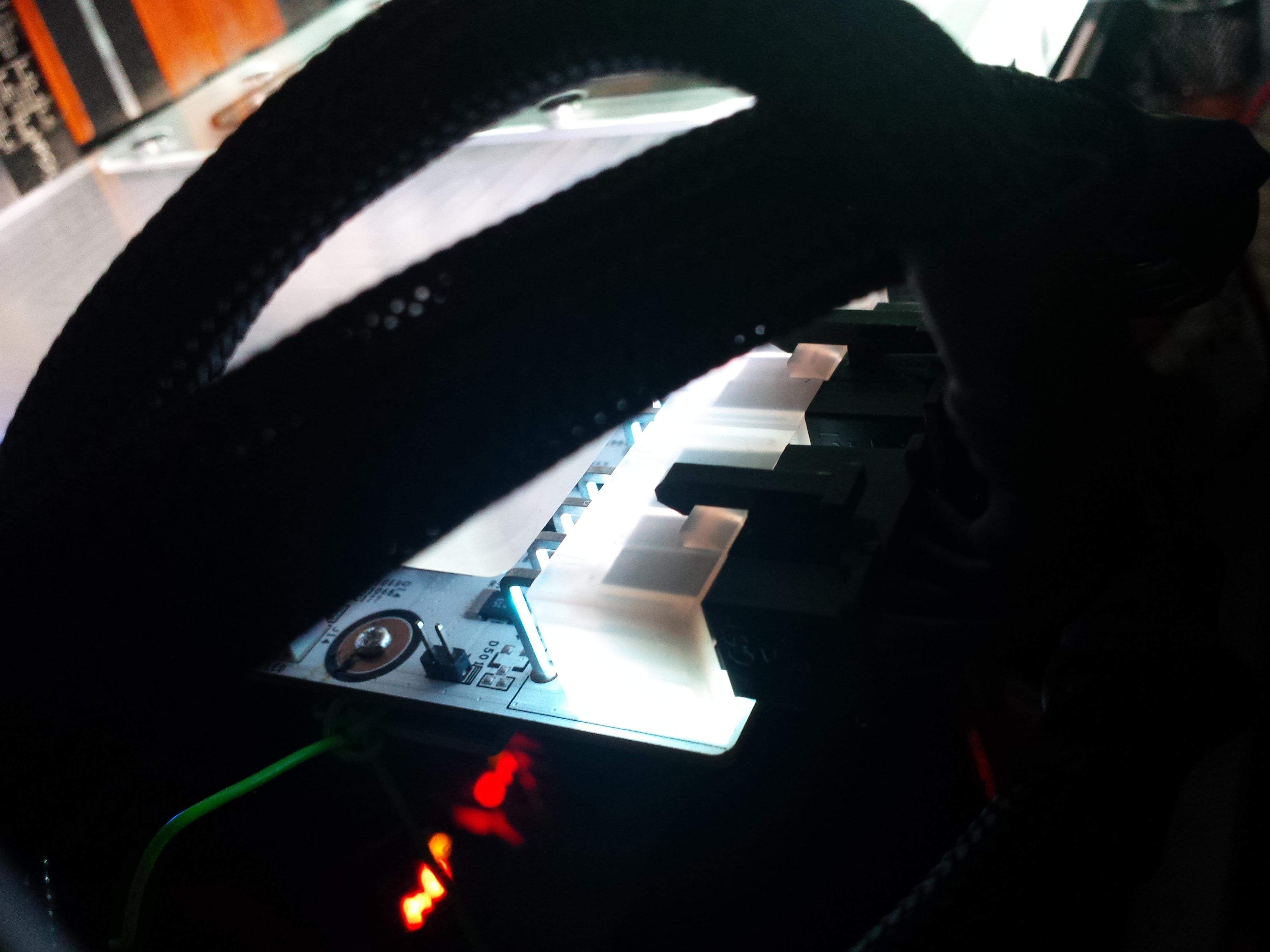 Links im Bild, am oberen Ende ist ein schwarzes Kabel zu sehen - etwas darüber dass angesteckte Gegenstück der Grafikkarte, hier handelt es sich um den LED-Anschluss.