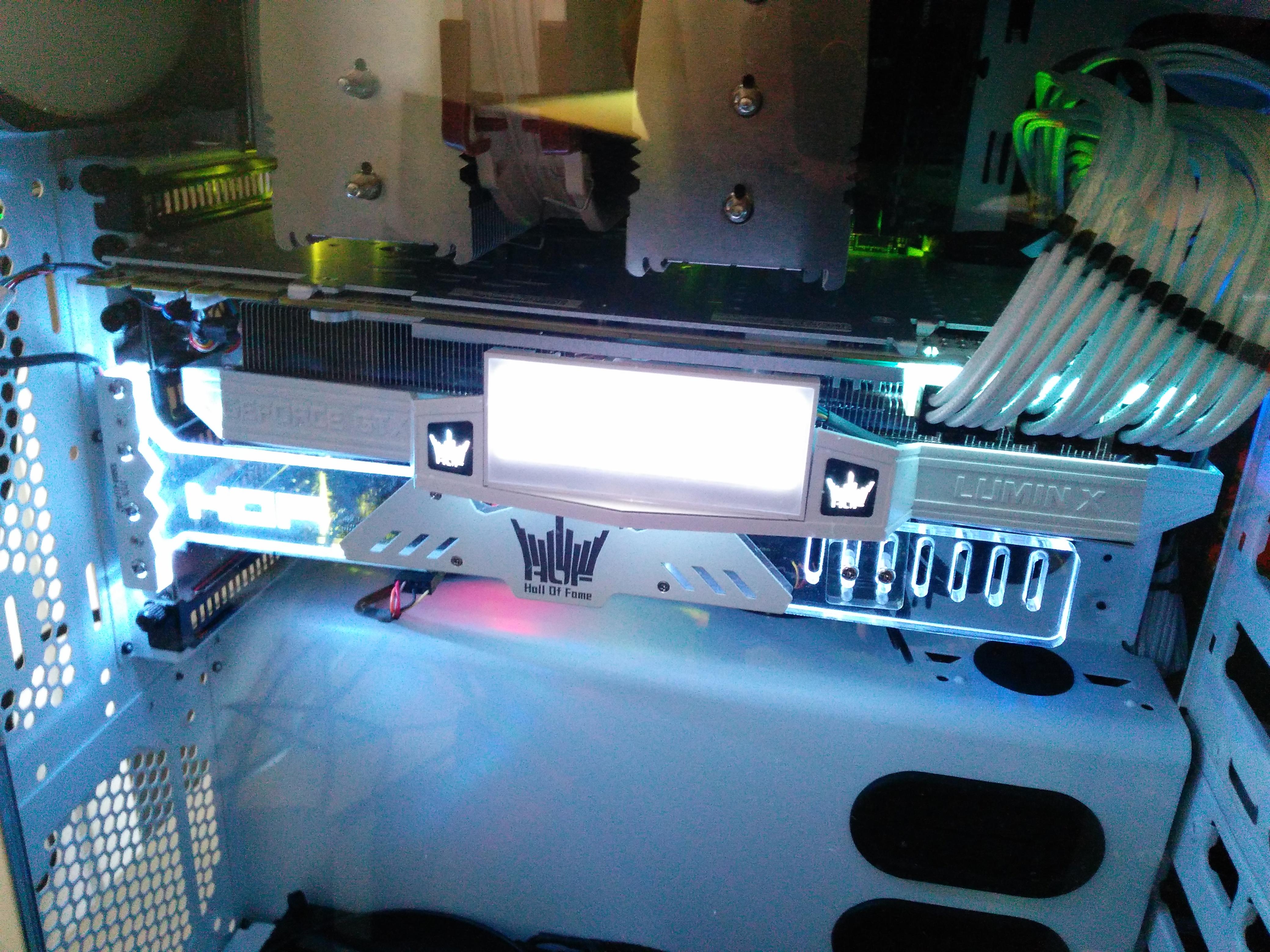 Etwas links unter dem "Lumin X" Schriftzug ist der kleine Plexi-Klotz zu sehen welcher mit bis zu vier Schrauben als tragende Haltestütze am Luminhold arretiert wird - je nach Lage der Grafikkarte eben.