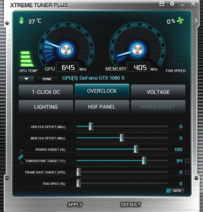 2. Overclock: Einstellbarkeit für GPU Clock Offset (Mhz), Memory Clock Offset (Mhz), Power Target (%)-Temperature Target (%), Frame Rate Target (FPS) und Fan Speed (%).