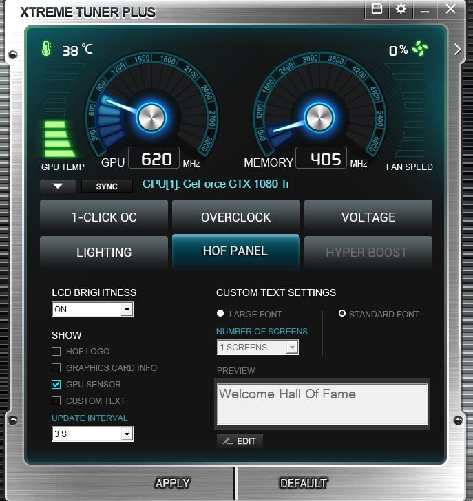 5. HOF Panel: Möglichkeit die Anzeige am GraKa Display anzupassen, in diesem Beispiel Temperatur und RPM angewählt.