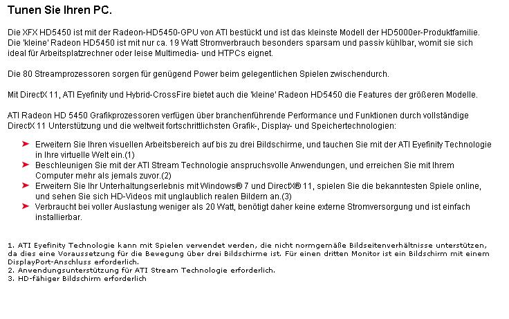 Zum Sound: Wenn es um Sound geht bin ich sehr altmodisch Ich gehe von der PS3 und vom HTPC via HDMI auf meinen Philips LCD-TV und von diesem via RCA jack (Cinch) auf meine ca 20 Jahre alte aber astreine Stereoanlage. Unter diesen Voraussetzungen ist der Sound der HD5450 100mal besser als der Onboard Sound des (alten) Shuttle Barebones! Keine Ahnung warum?! Ist aber so!