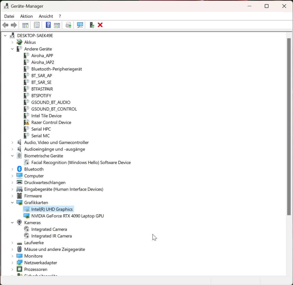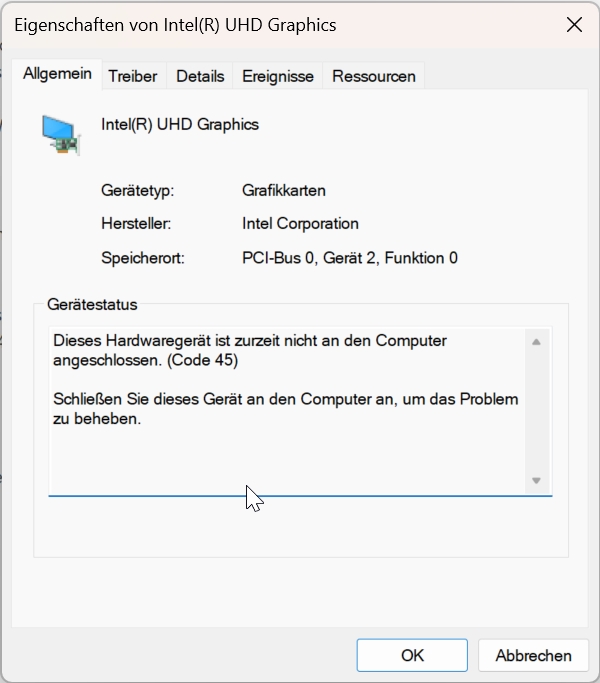 nachdem war die INTERNE Grafikkarte von Intel einfach deaktiviert und lest sich auch nicht aktivieren in der nVidia Software und auch nicht im Bios und auch nicht im Gerätemanager da taucht sie nur als Dieses Hardwaregerät ist zurzeit nicht an den Computer angeschlossen. (Code 45) auf