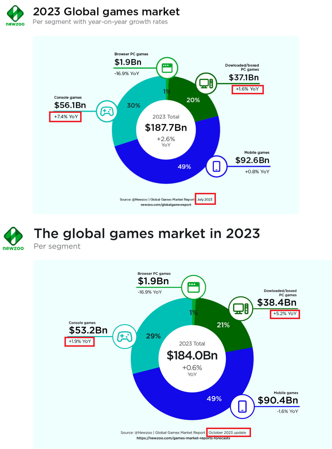 Bisher war Newzoo für 2023 bei einem Zuwachs von 7,4% für Konsolenspiele im Vergleich zu 2022 ausgegangen, nur 1,6% Zuwachs bei PC-Spielen.