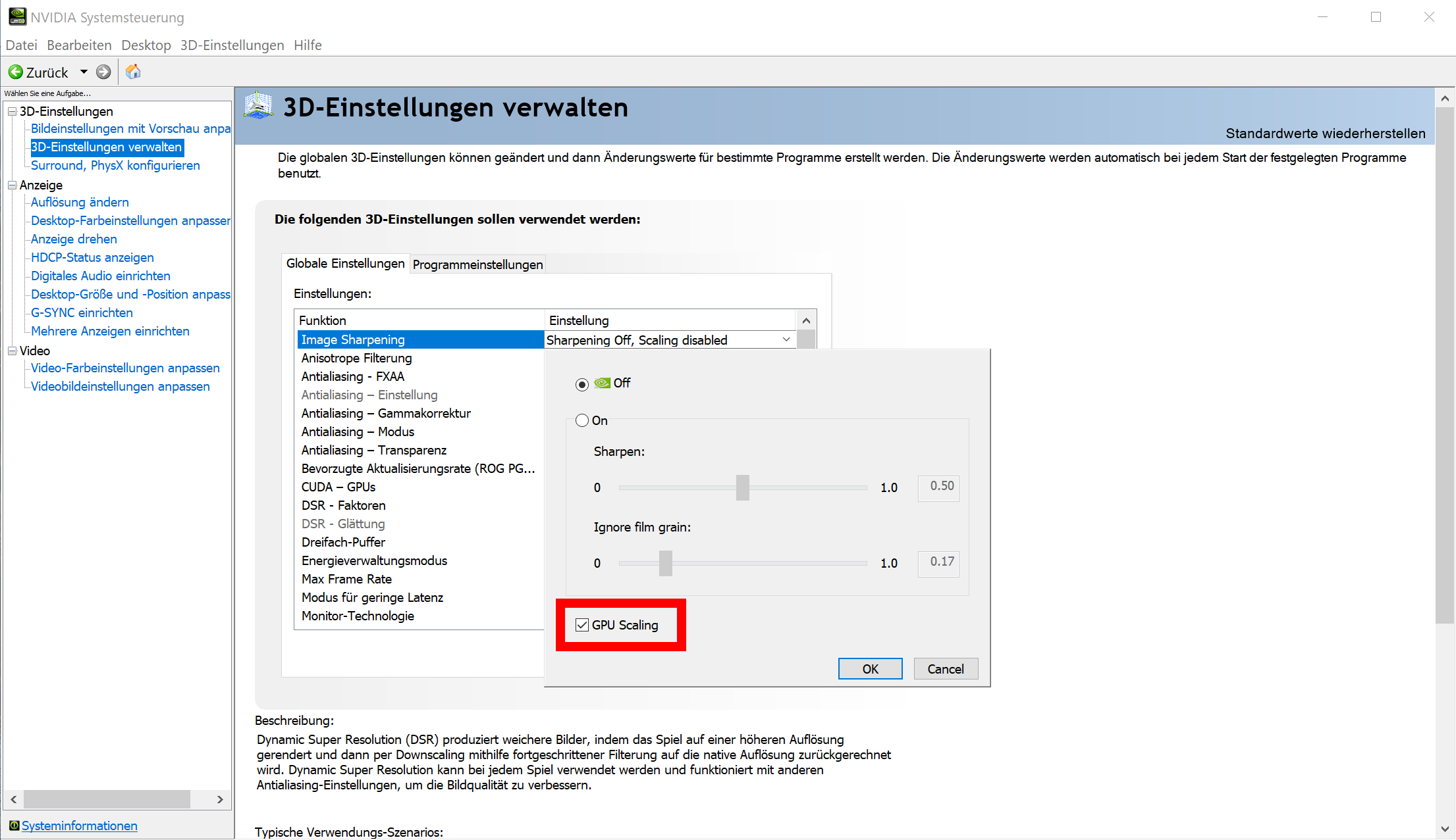 - Andere Auflösungen neben der nativen einmal eingestellt und wieder die Skalierungsoption geprüft -> grau