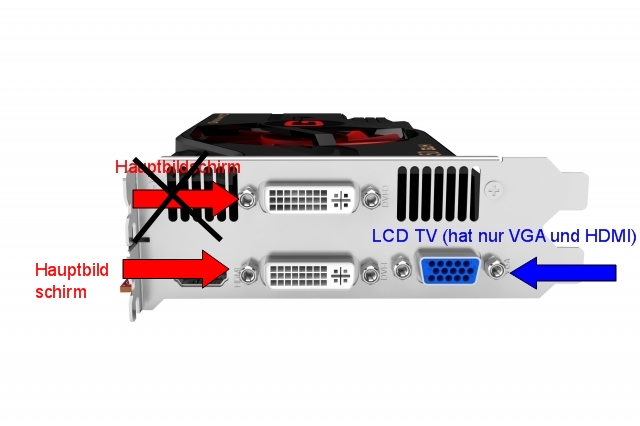 Seit glaub ich GeForce GTX2xx gibt es einen primären und sekundären Anschluss. Bei vielen Grafikkarten bleibt nun sogar beim Hochfahren der Monitor schwarz, sofern ein zweiter Bildschirm (zB TV) am primären dran hängt. Erst in Windows schaltet der Treiber das dann um.