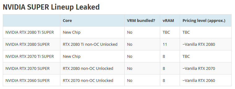 Wenn das stimmt sollten die bisherigen Versionen von Turing unter der 2080TI entweder EOL gehen oder im Preis sinken, denn Super wird laut diesem Leak zum Original-Preis von Turing angeboten.