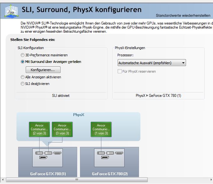 Ich hoffe die Profis unter euch können mir evtl. weiterhelfen. Und zwar möchte ich meine 3 Monitore nur für bestimmte Games im Surround Modus ansteuern. Im Desktop Modus soll weiterhin "Alle Anzeigen aktiviert" aktuell bleiben. Gibt es denn hierfür überhaupt die Möglichkeit? Meine PC Konfig steht in meinem Avatar und wie ich meine Monitore angeschlossen habe, seht ihr auf dem Bild: