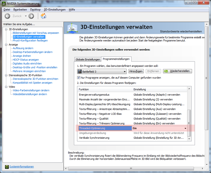 Hallo zusammen. Ich habe mich jetzt seit ein paar tagen im Internet informiert und bin irgendwie nicht wirklich auf eine sinvolle Lösung meiner Frage gekommen. Und zwar möchte ich wissen inwieweit es sinvoll ist im Nvidia Treiber Grafik Einstellungen Global selbst vorzunehmen, inwieweit diese Einstellungen die Spiel-internen einstellungen betreffen. D.h wenn ich jetzt hingehe und zum Beispiel die Texturfilterung auf Hohe Leistung stellen würde, und im Spiel stelle ich die Textur einstellungen auf die maximalen einstellungen, habe ich dann am ende schlechtere texturen da der Nvidia Treiber dann die texturen automatisch herunterschraubt und somit die Spielinternen einstellungen zwar nicht ganz aber teilweise ignoriert? Wenn ich zum Beispiel die Textur einstellungen auf beste Qualität stelle, habe ich dann eine bessere Textur ? die eigentliche Frage ist ja wie verhält sich das gegenüber anderen spielen, wenn ich Einstellungen vornehme die Antialising und versch. Grafikeffekte beeinflussen und das Spiel zum Beispiel nur 8x Antialising unterstützt kann es da zu unverträglichkeiten kommen oder passen sich die manuell eingestellten einstellungen im Treiber dem Spiel welches ich starte an? Was haltet ihr von der Einstellung die 3D Anwendung entscheiden lassen, ist es besser zum spielen, kann es zu inkompatibilitäten kommen wenn ich manuell an Effekten im Treiber etwas verändere?kann es bei spielen eventuell das Spielgefühl verschlechtern wenn in meinen Nvidia Treiber Einstellungen getroffen sind die das Spiel entweder nicht unterstützt, oder sind manche spiele auch so programmiert das es besser wäre die 3D Anwenung entscheiden zu lassen da diese Spiele mit diversen Effekten oder Texturen nicht programmiert bzw Konfiguriert wurden?