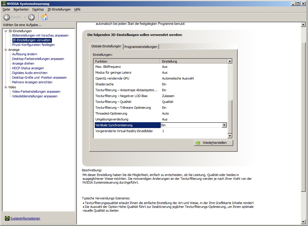 in der Nvidia systemsteuerung ist >Vsync ein< gestellt