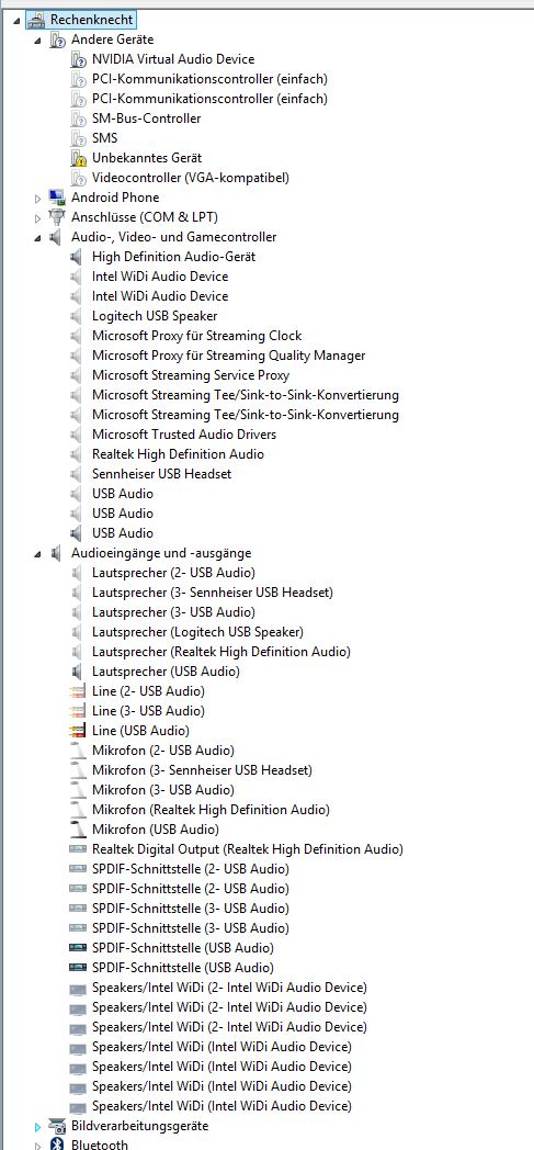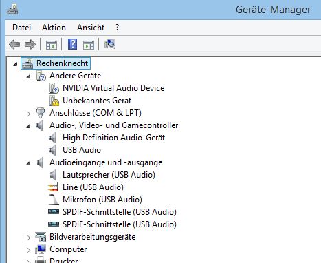 - unter andere Geräte: Nvidia Virual Audio Device und unbekanntes Gerät. Ich vermute, dass diese beiden Einträge die Ursache sind. Deaktivierung und Deinstallation bringen auch nichts - sie erscheinen beim nächsten Neustart wieder.