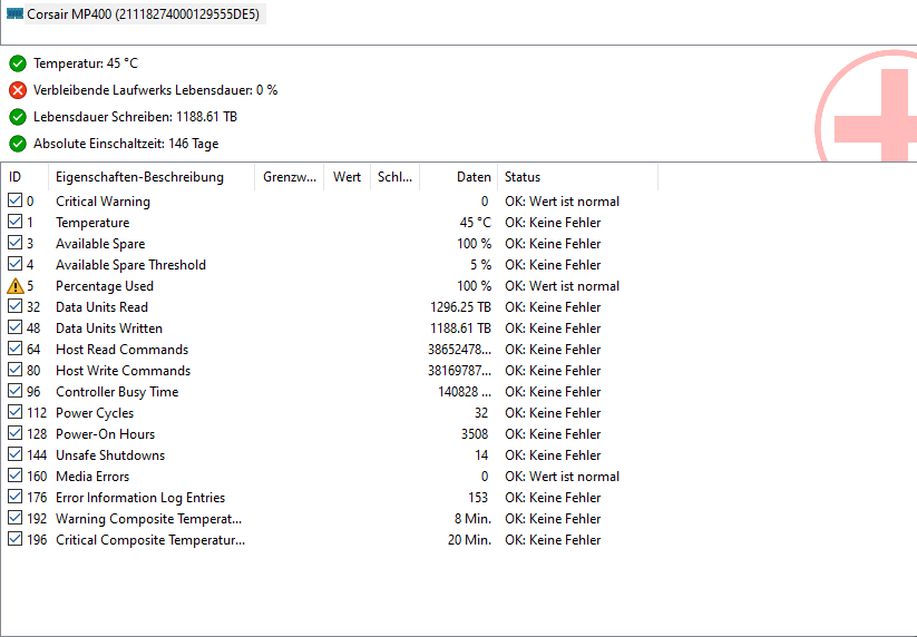 ich habe gestern eine gebrauchte NVMe bekommen und beim Auslesen mittels AIDA64 bekomme ich eine Lebensdauer von 0% angezeigt, bei Lebensdauer Schreiben ist der Wert auch ziemlich hoch