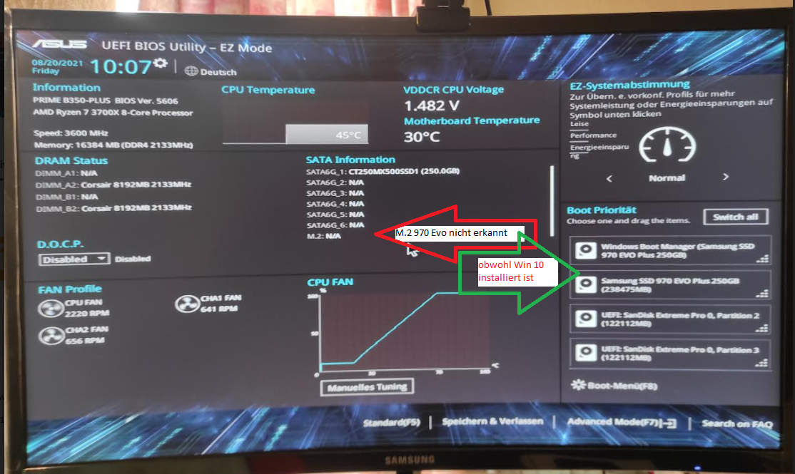 Im Screenshot steht doch fett "SATA", die 970 Evo ist aber kein SATA-Gerät (sondern eine NVMe), taucht also an der Stelle nicht auf. Bestenfalls M.2-SATA-SSDs würden dort erscheinen.Ponderosa schrieb:Bei meinem Asus Prime B350 plus Board wird meine 970 Evo Plus M.2 auch nicht erkannt, obwohl ich Win 10 darauf installiert habe.