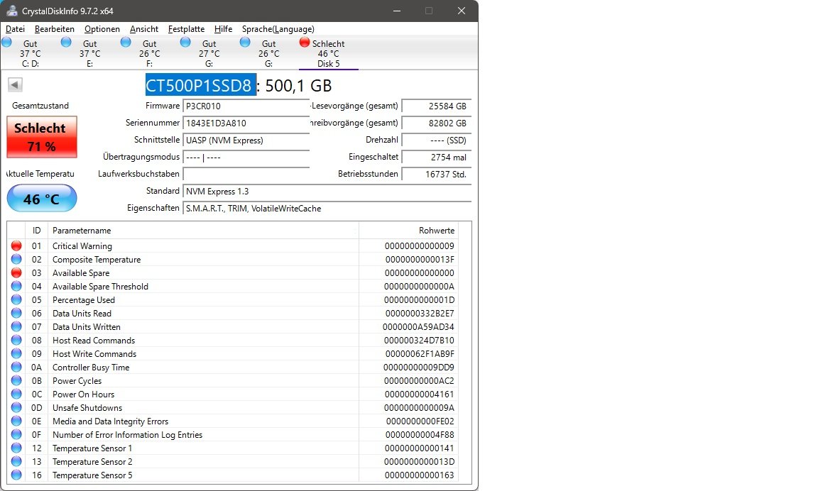 Zumindest im Hintergrund scheint zumindest noch irgendwas zu gehen, denn CrystalDisk ließ sich starten, öffnete aber erst nach Abstecken der SSD. Immerhin mit den zugehörigen Werten.