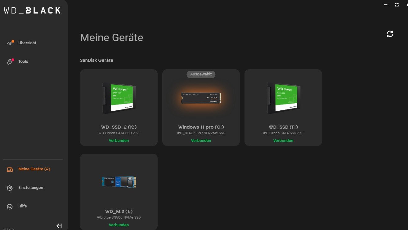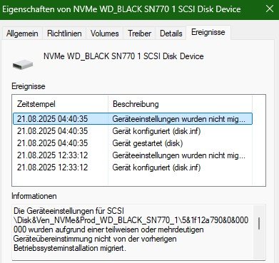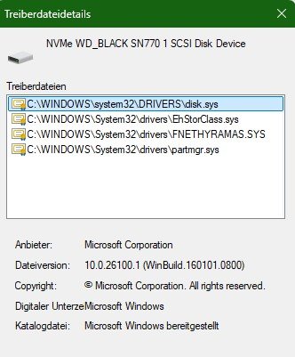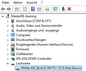 Die WD Black läuft ohne Probleme, hat eine normale Geschwindigkeit, aber wird nicht als SSD erkannt und wird deshalb auch nicht vom Dashboard erkannt. Im Gerätemanager steht NvMe WD Black SN770 ScSi Disk Device.
