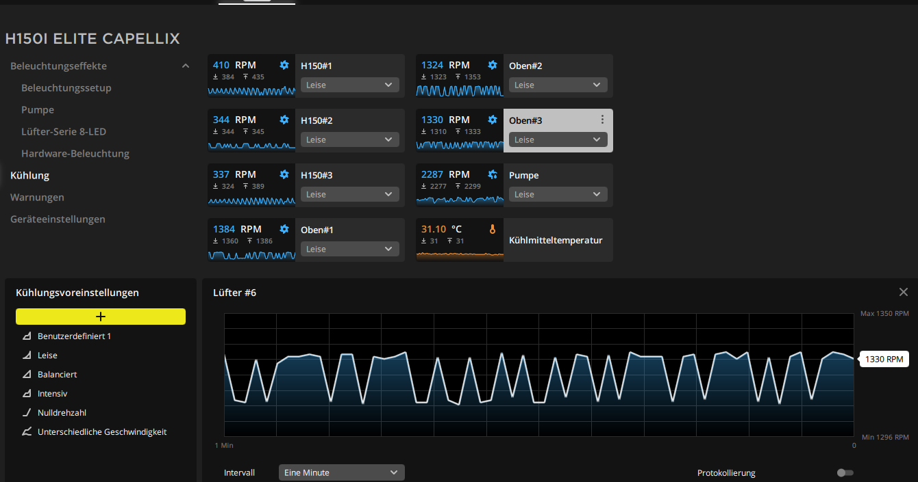 Auf meinem i7 12700k sitzt eine Corsair iCUE H150i Elite Capellix Wasserkühlung. In der iCUE Software kann ich im Bereich "Kühlung" die Lüfter steuern, was auch gut funktioniert bei den 3 Lüftern am Radiator. Zusätzlich sind aber 3x 120mm Corsair SP120 Elite RGB White als Lüfter oben im Gehäuse mit angebracht, die ebenfalls über die iCUE Software angesteuert werden können. Diese laufen permanent bei ca 1400 RPM und lassen sich nicht ändern . (Oben 1,2 3 im Screen). Alles ist am Commander Core angeschlossen. Weiß jemand woran das liegt?
