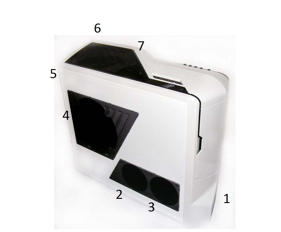 die Nummer 5 ist auf dem Bild übrigens nicht zu erkennen. Das ist der Lüfter über bzw. neben dem I/O Panel, der nach hinten raus bläst.