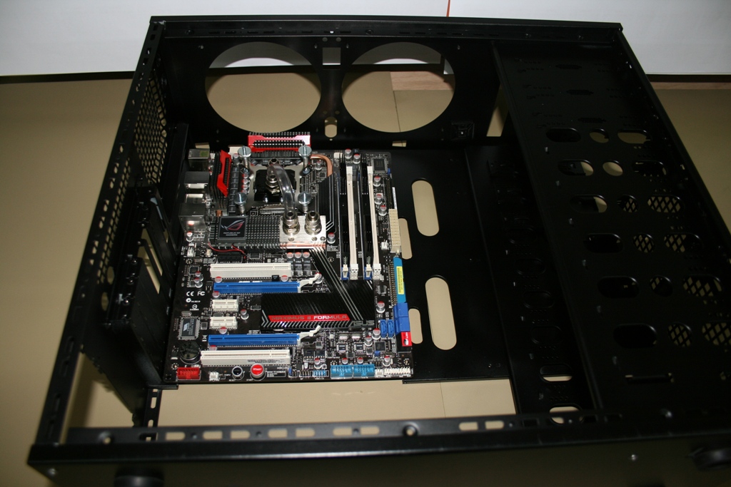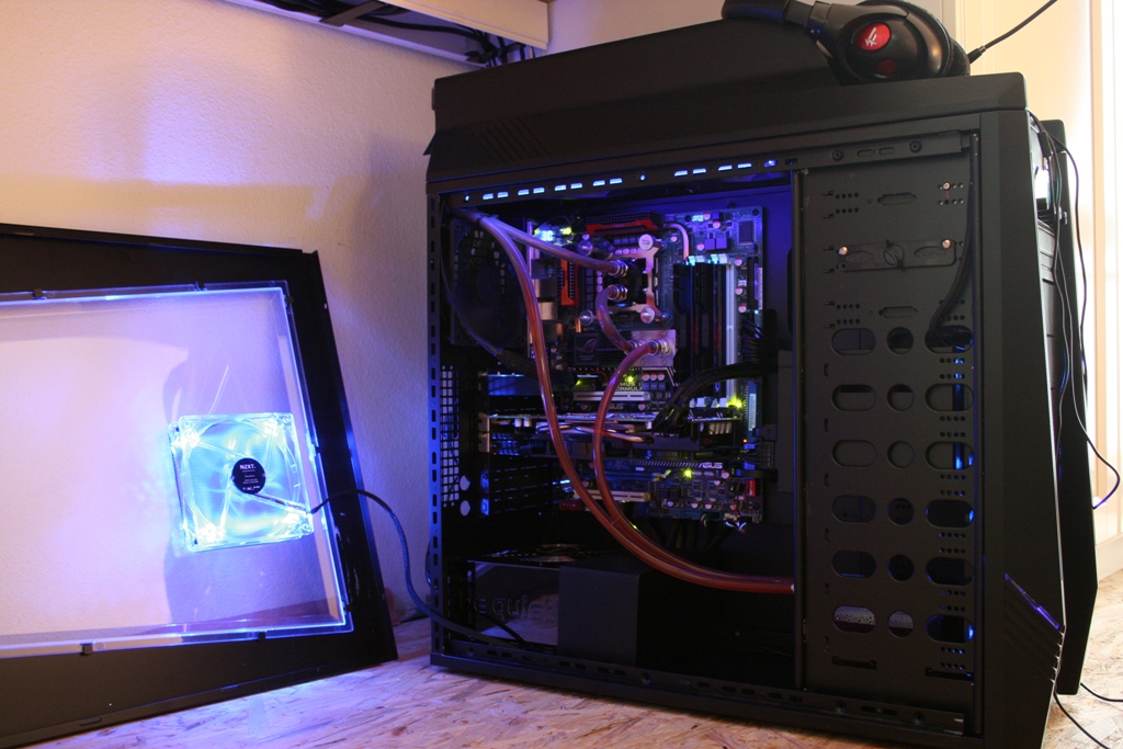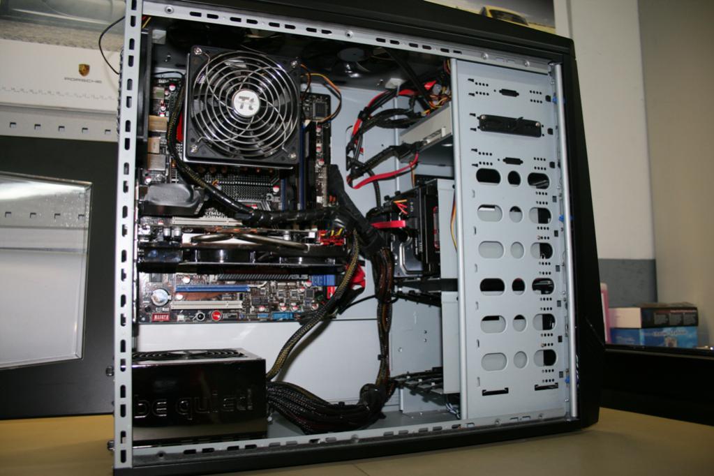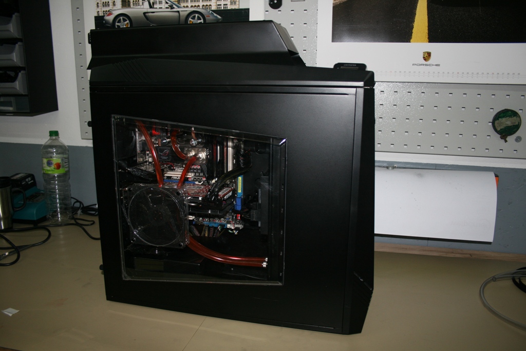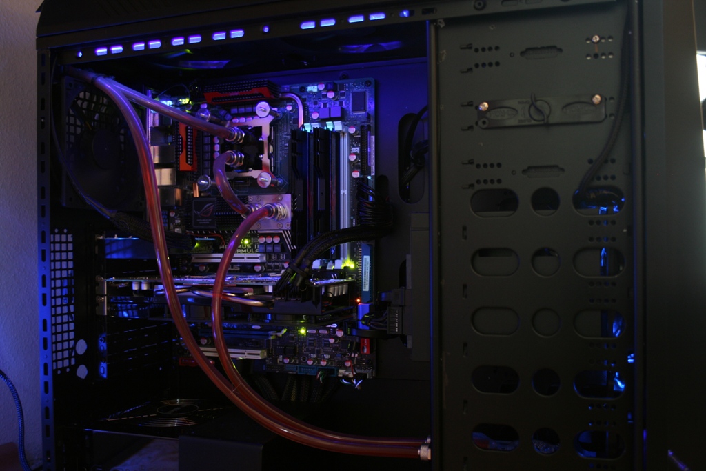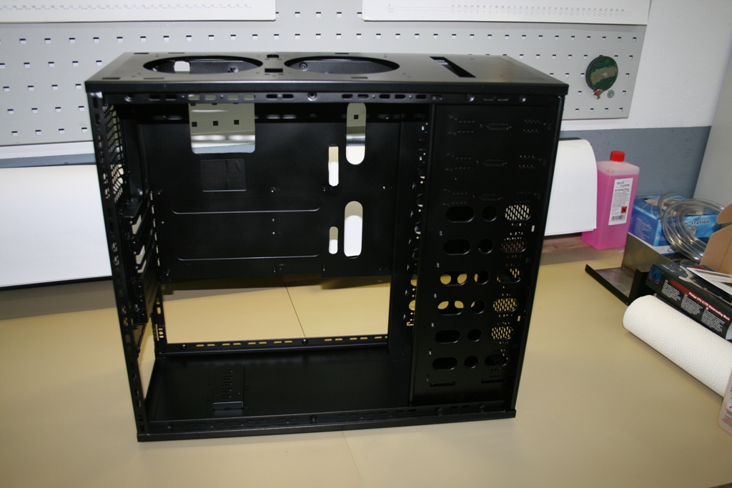 Ziel der Übung war ein komplett geschwärztes Gehäuse mit besserem Kabelmanagment und einer Wasserkühlung von Aquatuning.